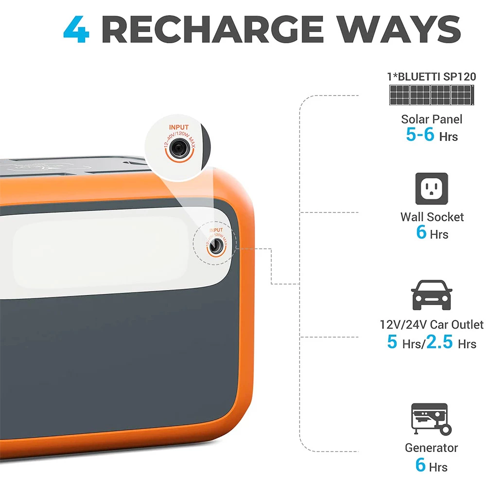 You can recharge your power station with an AC adapter at home, through the car outlet during a road trip, or simply use a solar panel. It takes about 4.5 hours to full recharge the power station from a wall outlet (220-240V AC adapter); about 4-5 hours to recharge it fully by BLUETTI SP120 120W solar panel (not Including, MPPT charge mode); or about 15 hours via 12V car charger.