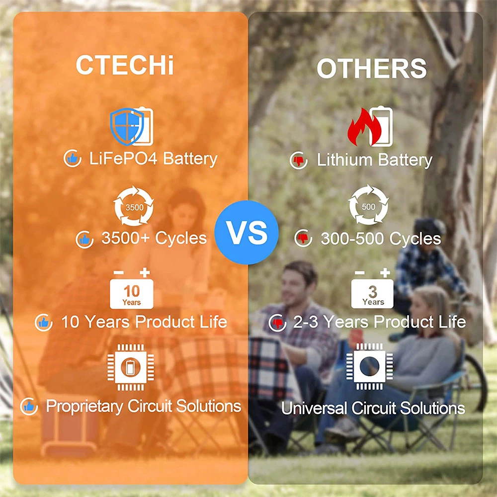 Features integrated LiFePO4 battery and BSM systems, it has a more stable and safer internal structure. The portable power station produces stable performance through a pure sine wave inverter to protect sensitive devices such as laptops and CPACs. The unique 20V board of the CTECHi prevents overheating of the battery and also protects you.