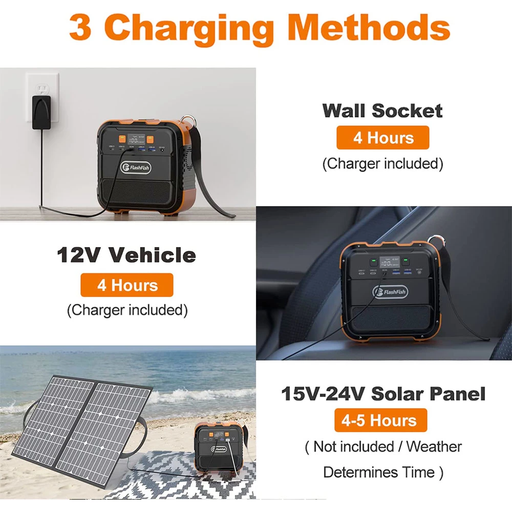 The small solar generator can be recharged by the Flashfish 50W/60W solar panel (SOLD SEPARATELY), the wall outlet, or the car outlet.