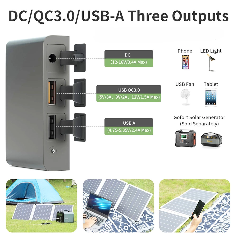 Gofort 60W foldable solar panel can be compatible with most solar generators on the market, 5.5*2.1mm DC cable for charging Gofort 330W/600W/1200W portable power stations as well as with portable generators from Rockpals, Suaoki, FlashFish. With 4 connectors (8mm /5.5*2.5mm /3.5*1.35mm /6.5*3.0mm), it can also be used with other solar generators from BALDR, Jackery, Goal Zero, Paxcess etc.
