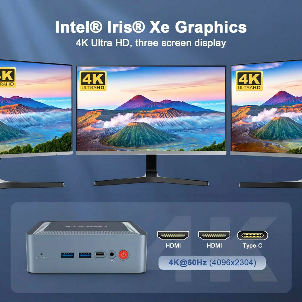 2. Mini Computer equips with Intel Iris Xe Graphics(1.3GHz Max Dynamic Frequency), supports 4K@60Hz(4096X2304) via dual HDMI 2.0 and 8K@60Hz(7680×4320) via Thunderbolt 4(Type-C). You can enjoy web surfing, 4K or 8K video playback, multitasking and gaming without any lagging and jumping. Reducing waiting time, doubling your work efficiency and provide more comfortable productivity with three monitors connected.