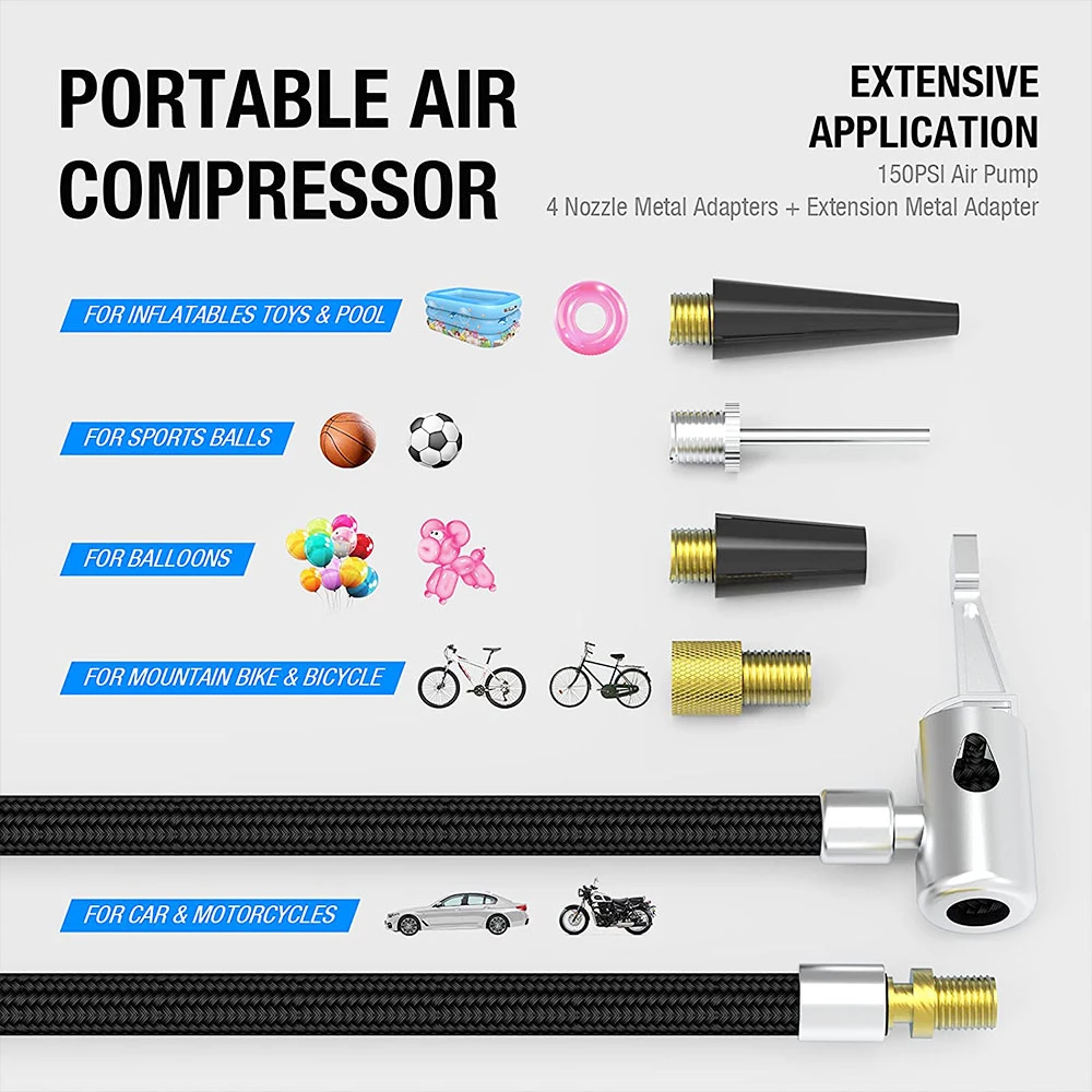 Comes with an extension air hose and 4 air inflation needles, this air compressor can be used to inflate air beds, kayaks, various balls, inflatable swimming pools, and more pumping products.