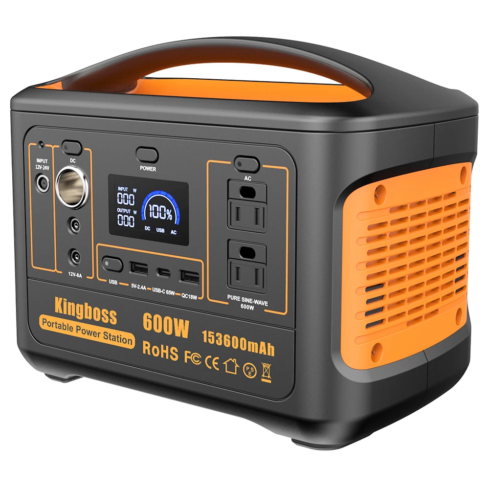 Kingboss 600W portable power station is equipped with 12V 8A vehicle charging output port, 600W AC output port, 5V2.4A USB output port, 18W QC3.0 port, and 65W USB-C port.
